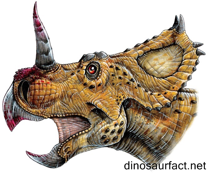 The fossils of the Centrosaurus are similar to those of other centrosaurian dinosaurs. But the most prominent feature of this dinosaur is its skull. The length of the skull was about 1 meter. It bore a prominent nasal horn that was about 50 cms in size. The skull also shows small brow horns near each orbit. The frills of the Centrosaurus have one large horn each. This horn is surrounded by smaller thorny projections or horn-lets. The frills are rectangular and smaller as compared to those of Chasmosaurians. The facial bones are elongated to form a beak like snout.