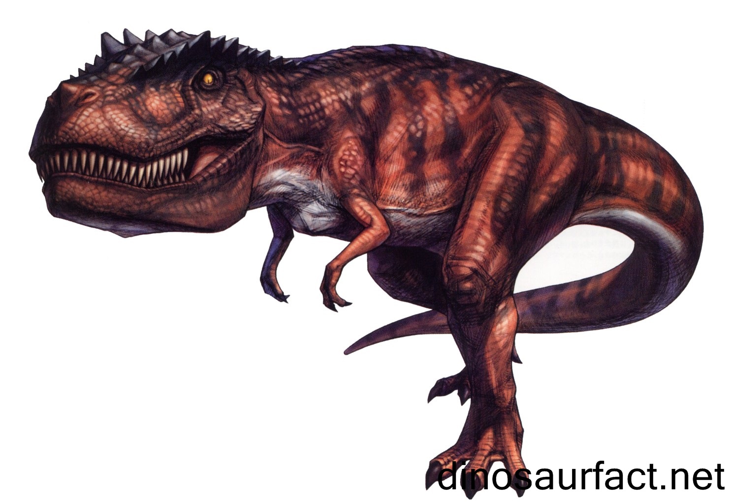 The hind limbs of this dinosaur were much better adapted for running than those of the Tyrannosaurus. It is judged that the Giganotosaurus could spirit at a maximum speed of 15 meters per second while the latter likely could not run beyond 10 meters per second without compromising stability.