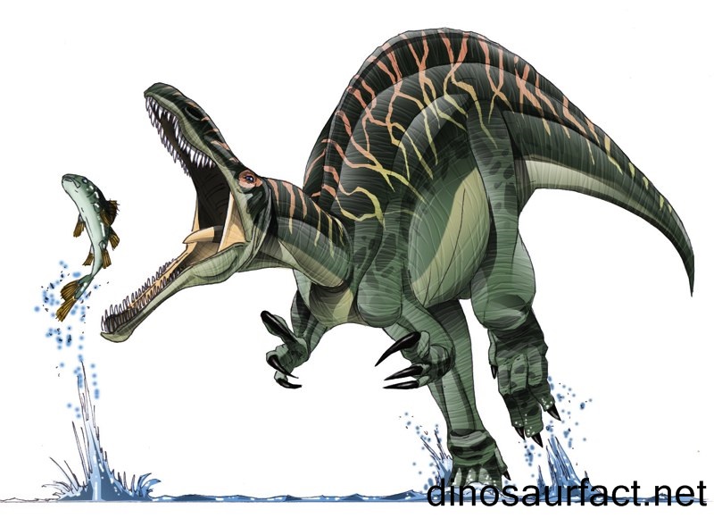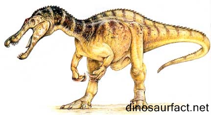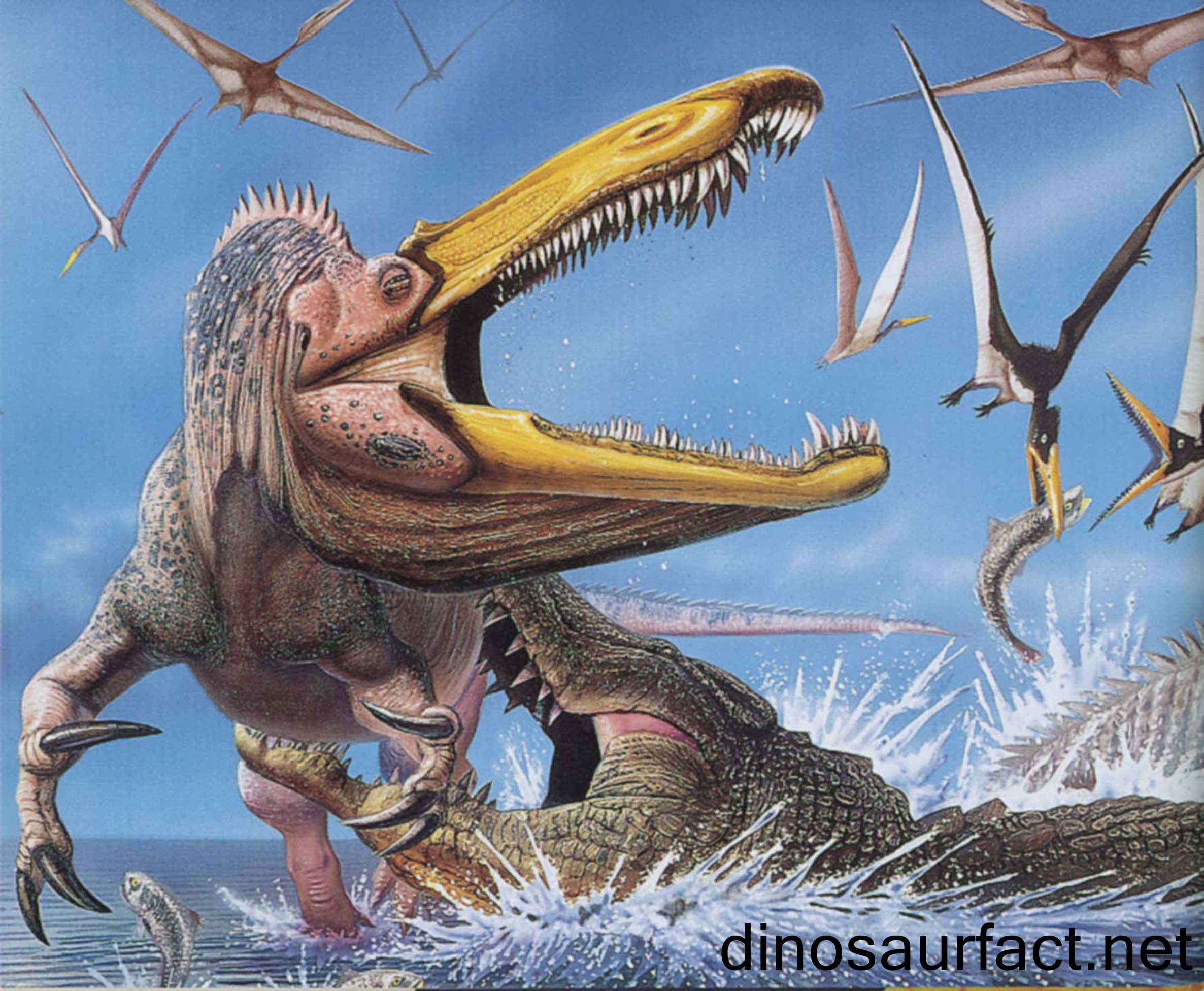 The Suchomimus was a huge shallow swamp land prehistoric creature at around 36 feet in length. The Suchomimus had an interesting skull. It was crocodile like, with a long snout and large rows of sharp teeth. Pretty much it was into eating fish on the North Africa Coasts.