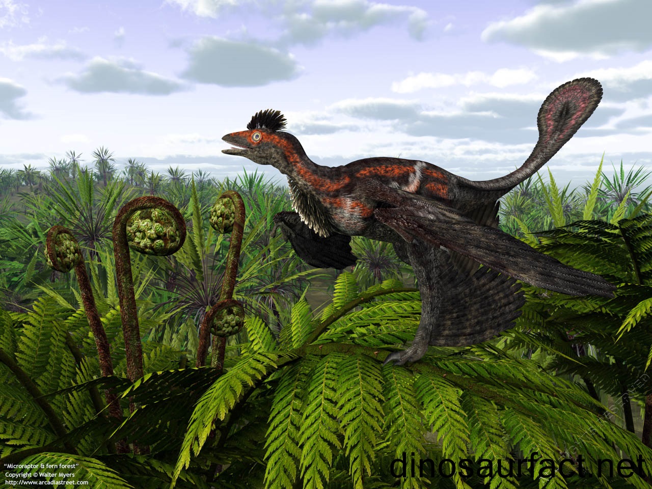 It seems unlikely that the Microraptor could fly as well as modern birds. Scientists believe that its pectoral girdle and sternum were not adapted to allow it to take off from the ground. It would need to jump from a height to be able to glide; may it travelled from one tree to another this way.