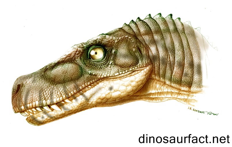 The jaw of this dinosaur had a flexible joint which could slide back and forth. This cranial development is rare among dinosaurs although it does manifest itself in some lizards. Jaws had large serrated teeth. The Herrerasaurus had a long, slender and flexible neck.